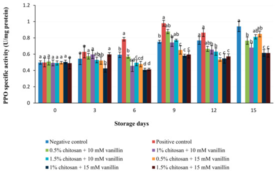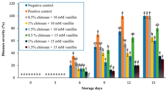 | 1.5% chitosan + 15 mM vanillin | 6.94 c | 9.16 e |
