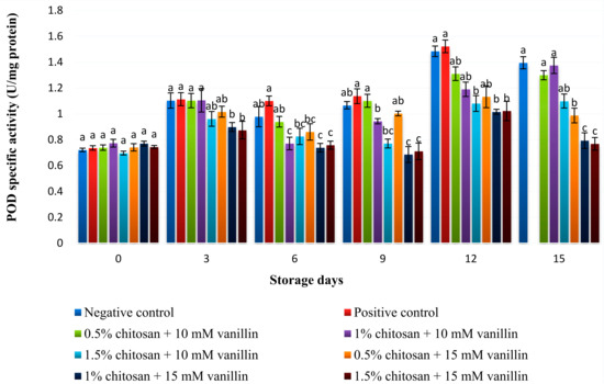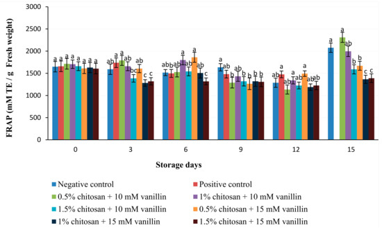 | 0.5% chitosan + 15 mM vanillin | 0.46 ab | 0.58 c | 0.96 bc |