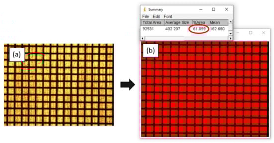 The morphology of the samples was investigated through an Optical Microscope (Nikon Eclipse ME600, Nikon, Tokyo, Japan). The as-acquired images (Figure 1a) were analyzed by ImageJ (1.8.0, National Institutes of Health, Bethesda, MD, USA) [] to determine the percentage of textured surface (%TS).