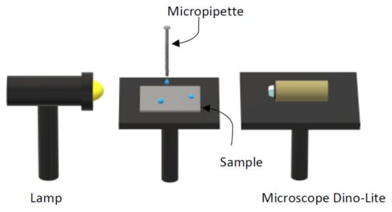 The surface wettability was evaluated by measuring the static contact angle (CA) of distillate water droplets by the sessile droplet method []. We used a digital goniometer, which consisted of a Dino-lite portable microscope and a cold light lamp for backlighting the droplet as reported in Figure 2.
