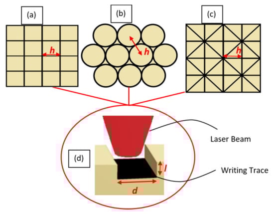 Several regular microgrid texture patterns were created on the AA2024 samples by scanning the fs-laser beam over the surface. Each single laser track obtained processing samples with the parameters listed in Table 1 had a depth of 10 µm and a width of 25 µm. Three different textures were executed: square, triangular and hexagonal-circle lattices with a different microgrid spacing, h. Figure 3 shows the sketch of the three texture patterns in which the pitch h, the diameter d of the focal spot and the depth l of the laser ablated groove (black colored lines) are highlighted (Figure 3d).