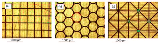 It is worth noting that for each texture geometry there were some sections of the grooves where the laser beam passed two or more times. For instance, in the case of the square lattice there were four intersection points (highlighted in red in Figure 4a) in which the laser passed twice. Similarly, in the circle pattern there were six segments of the perimeter of each circle where the laser scanning path overlapped twice (highlighted in red in Figure 4b). Finally, for the triangular texture, two different types of overlaps occurred. As shown in Figure 4c, while in the red intersections the laser beam passed twice, in the green ones the laser path overlapped four times. Therefore, it was assumed that the ablated grooves were two times deeper in the red areas and four times deeper in the green ones compared with the rest of the texture.
