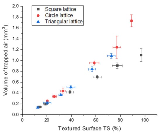 Volume of air trapped in a portion of 1 mm × 1 mm textured area as a function of the percentage of the textured surface (TS) for the three different texture geometries.