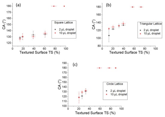 In Figure 6, the contact angle as a function of the percentage of the textured surface is reported for the droplet volumes 2 and 10 µL for the (a) square, (b) triangular and (c) circle lattice, respectively.