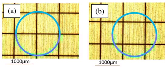 Sketch of two possible positions of a 2 µL droplet deposited on the square lattice having a pitch of 910 µm. The blue circle represents the droplet (a) enclosed by the crossed scan lines and (b) enclosing a machined square. The circle dimension was calculated for a droplet of 2 µL and a CA of 116° and resulted in being equal to 1.4 mm.