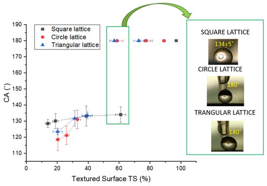 Evolution of the contact angle (CA) as a function of the percentage of the textured surface (TS) for the three different textures and a droplet volume of 2 µL. In the green rectangle, the images of the deposited droplet on the 60% textured samples are highlighted.