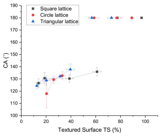 The rate of increase of the CA with the percentage of TS was different for the three textures. At a low TS, the square lattice showed the highest CA compared with the triangle and to the circle lattices. As the percentage of TS increased, the circle and triangle structures quickly reached the same hydrophobic properties of the square lattice and switched earlier to superhydrophobic behavior. The same results were observed for the 10 μL droplets as reported in Figure 9.