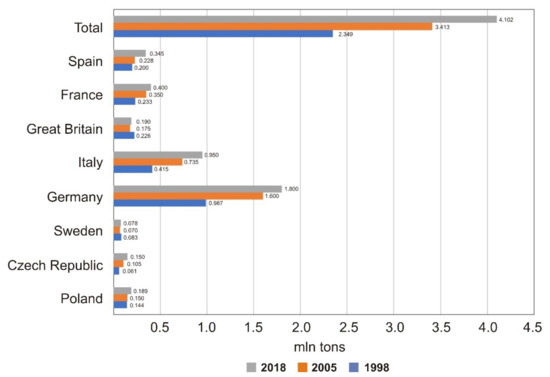 Share of European countries in the production of die forgings in 1998, 2005, 2018.