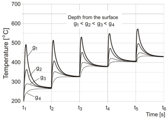 In the process of hot plastic working the forged material is heated to the temperature of 1000 to 1200 °C in order to reduce its yield point. The cyclically changing character of loads resulting from the specificity of the forging process makes the die heat up due to forging material and then cool cyclically. Temperature changes at various distances (gi) from the die face in subsequent cycles of the forging process are shown in Figure 2. It is estimated that the temperature in the die surface layer can achieve a value in the range of 600 to 900 °C [12,13,14].