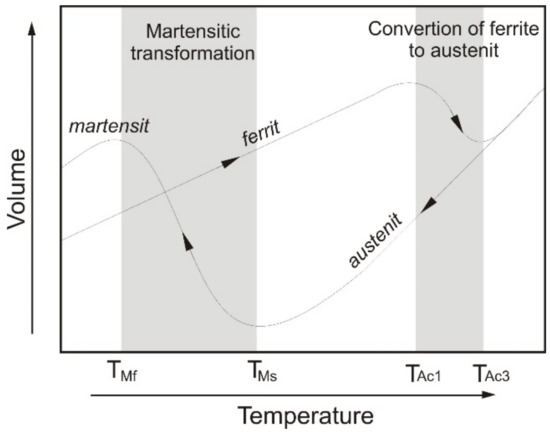 Diagram of material volume changes resulting from structural changes in steel. Reprinted from permission from [15]. Copyright 2007 the Łukasiewicz Research Network—Institute for Sustainable Technology.