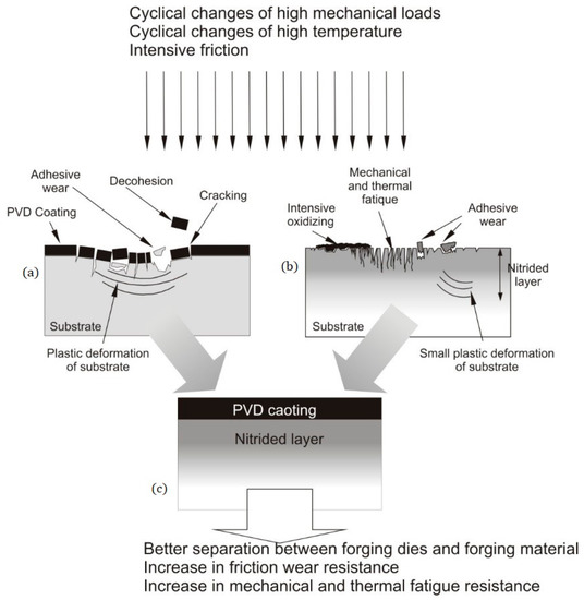 The best known hybrid layer made with the use of hybrid technologies consists of a nitrided layer—NL and coating obtained by physical vapor deposition method—PVD (NL + PVD) [52,53,54,55]. Due to interaction of two elements of this structure, i.e., the nitrided layer and the PVD coating, the hybrid layer is characterized by properties that would be unattainable if these elements were obtained separately. The behaviour of individual elements of the hybrid layer such as “nitrided layer/PVD coating”, and the combined effect of their interaction in the hot forming process were shown in Figure 4. The main factors which effect the forging dies are intense mechanical loads, high thermal shocks and intense friction. In case of substrates covered only with the PVD coating (Figure 4a) mechanical loads are the main destructive factor. They cause that the yield point is exceeded in the base material and, in effect, its plastic deformation. As a result, the hard and thin PVD coating breaks and loses its adhesion to the substrate. If only hard nitrided layer is present in the substrate (Figure 4b), the main destructive factor are intense, cyclical temperature changes causing thermal fatigue of the base material. Micro-crack mesh is appearing and spreading quickly causing deterioration of the surface quality, as well as local chipping. The surface is intensively oxidized and mechanical crushing and removal of oxides cause intensive abrasive wear. At the same time, high hardness of the diffusion zone reduces the susceptibility of the base material to plastic deformation. Simultaneous occurrence of the two mentioned structure elements, i.e., the nitrided layer and the PVD coating (Figure 4c), trigger their mutual interaction. The nitrided layer increases surface hardness and substrate resistance to plastic deformation in the near-surface zone. It ensures thus high stiffness of the substrate-coating system and protects the PVD coating against the loss of internal cohesion and adhesion with the substrate. The coherent PVD coating is an insulating layer for the nitrided substrate, limiting the influence of external factors on the process of its destruction. Thanks to correct adjustment of the PVD coating properties the friction coefficient can be effectively reduced and the wear and heat resistance increased.
