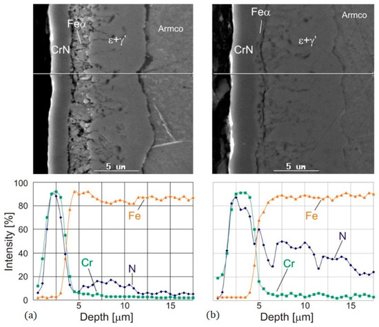 The structure of nitrided layer determines the possibility of transferring mechanical loads, but also significantly affects the adhesion of the PVD coating to the nitrided substrate. This is confirmed by different literature results [57,58] which showed that the layer of iron nitrides on the nitride surface layer is extremely important in this case. Sun and Bell [59], Smolik [60] and Beack [61] proved in their works that the denitriding of iron nitrides can occur even at a temperature of 400 to 500 °C and it is possible to create a soft layer of pure iron on the surface. The presence of nitrogen in the ion etching atmosphere has a significant influence on this process. Figure 5 shows the results of iron nitride decomposition which took place in the process of ion etching of the nitrided layer, preceding the deposition of the CrN coating. The ion etching process was performed in two different atmospheres: Cr+ plasma (Figure 5a) and Cr+ + N+ plasma (Figure 5b). In both cases plasma was produced by means of the Arc Evaporation method. The SEM observations as well as linear analysis of changes in the chemical composition by EDS method showed that the decomposition of iron nitrides to the pure iron layer is greater in nitrogen-free atmosphere.
