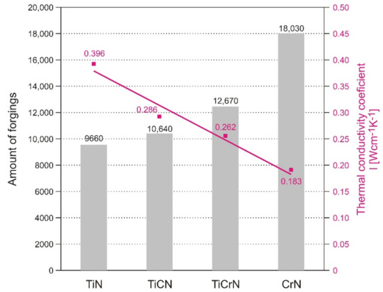 Comparison of the forging dies durability covered with hybrid layers: “nitrided layer + PVD coating”, with the value of the thermal conductivity coefficient (λ) of various PVD coatings. Reprinted from permission from [56]. Copyright 2016 the Łukasiewicz Research Network—Institute for Sustainable Technology.