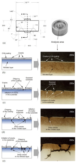 Results presented in Figure 6 showed that dies covered with the hybrid layer NL + CrN are characterized by the best durability, compared to three other PVD coatings tested. The destruction mechanism of the forging dies covered with the hybrid layer NL + CrN [54,67,68], where the thickness of CrN coating was 4 microns, are presented schematically in Figure 7. A specially designed research die was used for this purpose, as shown in Figure 7a.