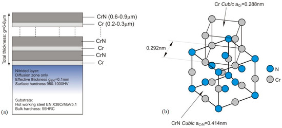 The scheme of the Cr/CrN multilayer coating: (a) multi-layered structure, (b) crystallographic fit. Reprinted from permission from [15]. Copyright 2007 the Łukasiewicz Research Network—Institute for Sustainable Technology.