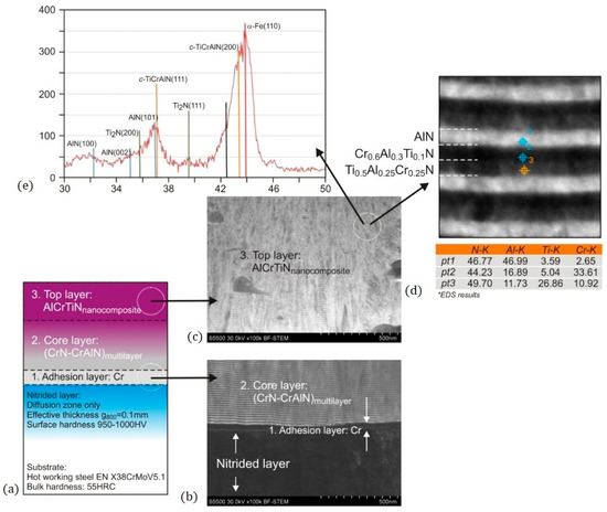 Another direction of material development of NL+PVD hybrid layers intended to increase the forging dies durability were “Triple Coatings” consisting of three functional zones: 1. adhesion layer, 2. core layer (monoblock, gradient or multilayer), 3. top layer (nanocomposite) (Figure 9a). An example of “Triple Coating” is the Cr/(CrN-CrAlN)multilayer/AlCrTiNnanocomposite coating, shown in Figure 9. The purpose of creating such complex PVD coatings was to increase the cohesion of the multilayer structure and, at the same time, obtain a top layer consisting of multi-metallic nitrides. Multimetallic nitrides are characterized by much higher heat resistance which is about to ≈1000 °C [85] for multi-component coatings (Ti,Cr,Al)N. For this purpose the creation of hybrid layers of the NL+PVD coating type with multi-component coatings such as e.g., (Cr,Al)N, (Ti,Cr,Al)N [86], (Ti,Si,Al)N [87], (Ti,Cr,Al,Si)N [88] has been proposed. However, due to different chemical composition and zonal distribution of plasma sources, as well as the rotation of coated elements, nanocomposite coatings are often a multilayer mixture of multi-metal nitrides (Figure 9d). The chemical composition of nitrides deposited in individual component layers depends on operating parameters of individual plasma sources, intensity of emission of individual elements from the plasma sources, as well as the speed of their surface diffusion on the coated substrates. In case of the hybrid layer NL + Cr/(CrN-CrAlN)multilayer/AlCrTiNnanocomposite, it was shown that the dominant nitrides in the AlCrTiNnanocomposite top layer are polymetallic nitrides: Ti0.50Al0.25Cr0.25N, Cr0.6Al0.3Ti0.1N and a small proportion of monometallic nitrides AlN, Cr2N, Ti2N (Figure 9d,e).