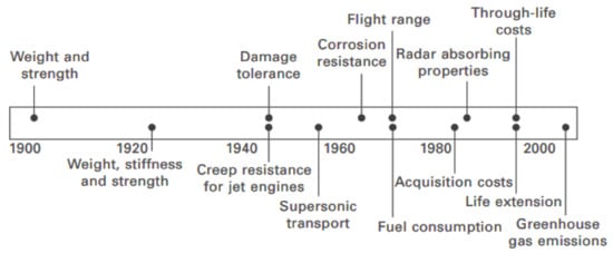 Historical timeline indicating when critical measures for materials selection were introduced into aircraft design [].