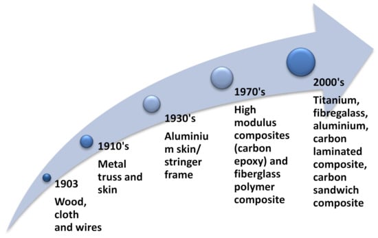 In the manufacturing of airframe structures, advanced materials and processes have led to their evolution from simple wood truss structures to today’s sleek aerodynamic flying machines. Aligned with technology development, the airframe structure design required the materials to be lightweight, high toughness, high strength, corrosion resistance, easy reparability and reusability, less maintenance, and durability []. Figure 2 depicts the evolution of material used in airframe structure until now.