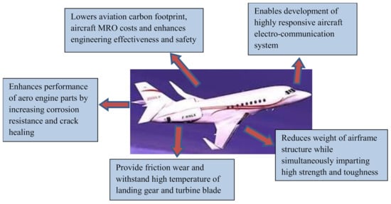 The antiquity of nanomaterials has instigated somewhere near the big bang with the formation of nanoparticles in space after comets, asteroids, and meteorites have collided and formed nanoparticles of various compositions. Bestowing to the International Organization for Standardization (ISO), the preface “nano” symbolizes a size ranging between 1 to 100 nm []. Consequently, nanomaterials are more significant than a single atom with ultimate control over discrete material properties, some of which are relevant to the aviation industry: