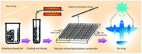 Furthermore, Karim et al. [] have made a highly conductive graphene-based glass fiber roving dedicated for the use of de-icing applications. They have coated the glass fiber roving with a graphene-based solution using a dip-dry-cure technique, as shown in Figure 4. The graphene-based glass shows a low resistance from their experiments, which is around 1.7 Ωcm−1, and effective warming to an ideal temperature at lower control utilization. They found that the de-icing test demonstrates proficient expulsion ice from graphene-based composite.