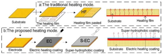 - Zhao, Z.; Chen, H.; Liu, X.; Liu, H.; Zhang, D. Development of high-efficient synthetic electric heating coating for anti-icing/de-icing. Surf. Coat. Technol. 2018, 349, 340–346. [Google Scholar] [CrossRef]