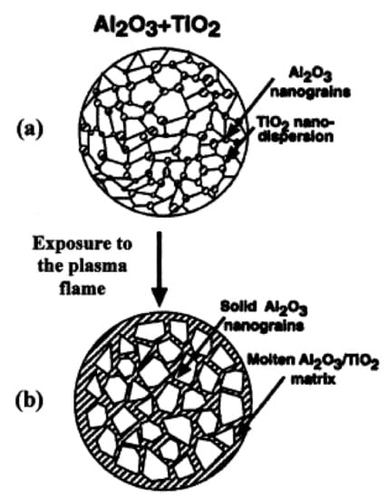 The second challenge is to retain grain size at the nanometer regime in the coating, which may be achievable through using Al2O3-TiO2 powder feedstock. McPherson [] found that if the partly melted particle has high enough viscosity and impact velocity during thermal spray is not too high, there is a chance of this particle incorporated into the coating during the thermal spraying process. Shaw et al. [] implemented short exposure to the plasma flame, and the TiO2 particles will be melted. At the same time, the Al2O3 nanograins will remain unmelted due to melting point different for both materials, as shown in Figure 6. This study concludes that nanostructured Al2O3-TiO2 powders have been successfully reconstituted into thermal sprayable feedstock. Besides all the research mentioned above, Table 3 below summarizes other investigations done in the last five years.