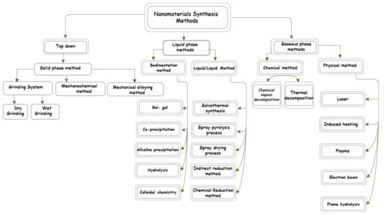 The bottom-up approaches can be further divided into two groups, namely (i) gaseous phase methods; and (ii) liquid phase methods. Gaseous phase methods include: (a) chemical methods involving a chemical reaction such as chemical vapor decomposition (CVD) and thermal deposition; and (b) physical vapor decomposition (PVD) methods which involve evaporation of liquid or solid material using either laser, plasma, electron beam, induction heating or flame hydrolysis and rapid cooling of the evaporated material yielding the desired nanomaterials. Liquid phase methods have been the primary methods for the generation of nanomaterials for many years. They can be further subdivided into two types, i.e., (i) liquid/liquid methods: which include chemical reduction method, indirect reduction method, spray pyrolysis, spray drying and solvothermal synthesis; and (ii) sedimentation methods: which include the sol-gel method, alkaline precipitation, co-precipitation, hydrolysis, and colloidal chemistry method. The gaseous phase methods prevent the severity of nanomaterial organic impurity compared to the liquid phase processes, but they require the use of complex, low efficiency, and high costs vacuum devices. The CVD method can produce ultra-fine materials of size less than 1 μm utilizing gaseous phase chemical reaction. Nanomaterials from 10 to 100 nm can be generated by careful reaction control. The CVD process involves heating source such as a chemical fire, a plasma process, laser, or an electric furnace to perform the high-temperature chemical reaction. In the production of metal oxide or other types of materials, the thermal decomposition method was particularly useful as an industrial preferable synthesis method. A typical example of a liquid/liquid method is the chemical reduction of the metal ions whose primary benefit is the easy manufacturing of materials of various forms, such as nanorods, nanofilms, and nanofillers. By changing the reducing agent, the dispersing agent, the reaction temperature, and time it is possible to alter the shape and the size of the nanomaterials. It reduces the metal ions to their zero oxidation levels through chemical reduction. The method uses uncomplicated tools or instruments and can produce large amounts of nanomaterials for a limited period of time at low cost. Metal oxide nanomaterials were manufactured by the sole-gel process extensively. The hydrolysis, accompanied by polycondensation to a gel, converts a solution of a metal oxide into a sol. The wet process ensures that the nanomaterials are dispersed in comparison with the dry techniques [,]. Besides that, if the subsequent nanomaterials are dried, the aggregation of the materials will soon follow. In this case, it is possible to re-disperse the solid phase method using the procedure.