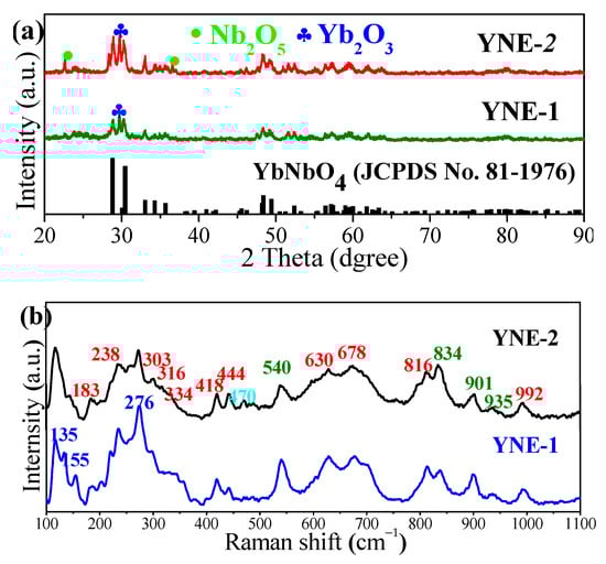Figure 1b shows the vibrations associated to Raman scattering for YNE-1 and YNE-2 phosphors. Raman bands around 117, 183, 303, 316, 334, 418, 444 and 816 cm−1 are agreed with the literature data reported for the YbNbO4 []. The Raman peaks at 418 cm−1 and 334/816 cm-1 are assigned to Nb-O anti-symmetric and symmetric modes of NbO4 tetrahedral structure, respectively, meaning that YNE-1 and YNE-2 have a regular NbO4 tetrahedron with no interactions and distortions []. Additionally, YbNbO4:Er3+ phosphors here also possess the similar structure to H-Nb2O5 due to the appearance of Raman bands at 238, 630, 678 and 992 cm−1 []. The Raman peaks observed at 540, 834, 901 and 935 cm−1 represent the existent of the impurity phase Nb2O5 [,,], and Raman bands at 470 cm−1 is assigned to the phase Yb2O3 []. The phonon energies below 300 cm−1, including 135, 155 and 276 cm-1, are assigned to external vibrations []. Referring to XRD and Raman spectra, the formation evolution of YbNbO4:Er3+ could be understood by the following equations [,]: