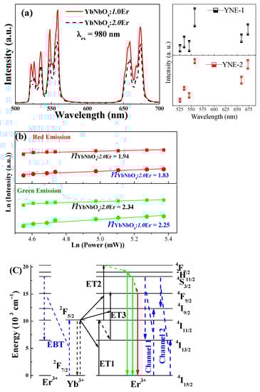 To understand UC mechanisms, the intensity of fluorescence (If) is measured as a function of the pump power (P). Log–Log plots of pump power dependence in YbNbO4:Er3+ phosphors are shown in Figure 3b. For an unsaturated UC process, the number of pump photons (n) required to populate the emitting state can be obtained via the formula: If ∝ Pn []. As for YNE-1 and YNE-2, respectively, the slope values of the green UC emissions are fitted to be 2.25 and 2.34, and the red UC emissions yield n = 1.83 and 1.94, indicating that at least two 980 nm laser photons are needed to populate both green and red UC emissions [].