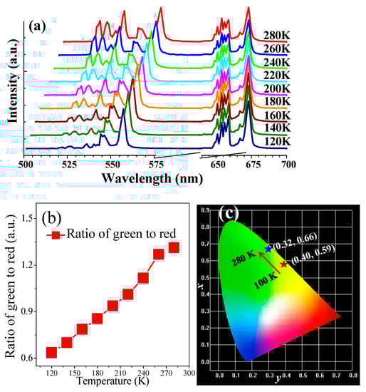Figure 4 shows temperature-dependent on green emissions at 530 nm/558 nm of YNE-1 phosphor in the temperature range of 120–280 K under 980 nm excitation. As the temperature increases (Figure 4a), the intensity of the green emission at 530 nm is observed to increase with respect to the emission at 558 nm, and the red UC emission at 672 nm increases. As illustrated in Figure 4b, the intensity ratio of the overall green to red emission (Ratio of green and red) is increased with increasing temperature. The international commission on illumination (CIE) chromaticity diagram used to reflect the true color of luminescences at different temperatures is shown in Figure 4c. Based on 1931 CIE chromaticity theory [], the color coordinates (x, y) of YNE-1 phosphor are calculated to be (0.40, 0.59), (0.39, 0.60), (0.38, 0.61), (0.37, 0.62), (0.37, 0.62), (0.35, 0.63), (0.34, 0.64), (0.33, 0.65) and (0.32, 0.66), respectively, from the temperature ranging from 120 to 280 K. Therefore, the observed gradual change of color tone from yellow to green region implies that YbNbO4:Er3+ may have an ability of the temperature-dependent color tuning property.