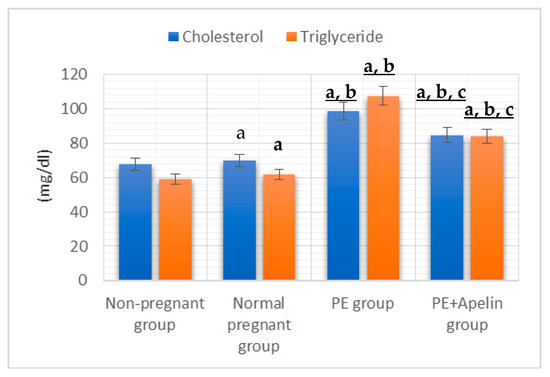 Concerning the effects of L-NAME administration and treatment with apelin on the serum levels of cholesterol and triglycerides at GD 20, the obtained results revealed that the administration of L-NAME to pregnant rats significantly increased serum cholesterol and triglyceride levels in rats with preeclampsia, while apelin treatment reversed the PE-associated elevations. These results demonstrate the beneficial effects of apelin on preeclampsia.