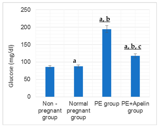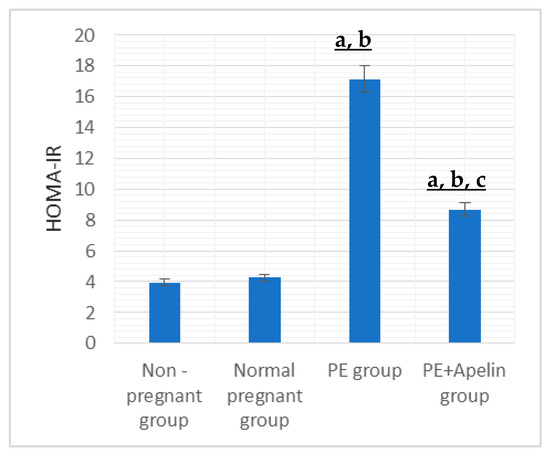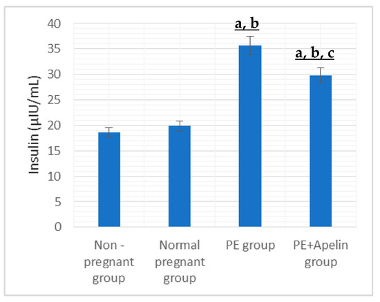 This may be due to blockage of the expression of eNOS in the placenta and the levels of NO and eNOS in the serum in PE, which causes peripheral insulin resistance, secondary to blockage of the hepatic parasympathetic reflex release of hepatic insulin sensitizing substance in response to insulin [40]. Thus, apelin helps to ameliorate these effects as it has a direct activating effect on the L-arginine/eNOS/NO pathway [35,51]. These results suggest that restoration of the eNOS/NO pathway may be involved in the ameliorative effects of apelin on preeclampsia. Additionally, oxidative stress and inflammation have been suggested to contribute to insulin resistance [52].