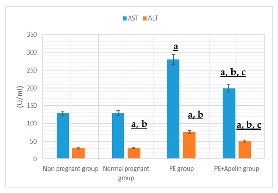 The elevated serum level of AST in preeclampsia is explained by the effect of hypoxia on the liver in cases of preeclampsia in pregnancy. The disruption of the endothelium leads to a reduction in the prostacyclin level and an increase in the thromboxane level, which causes the blood vessels of the liver to vasoconstrict, leading to the necrosis and degeneration of hepatocytes and thus increasing ALT and AST levels [36].