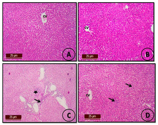 Histopathological findings in hepatic tissues of treated groups, respectively.