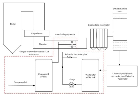 After chemical precipitation, concentration and clarification, spraying desulfurization wastewater into the flue duct and using exhaust flue gas heat for evaporation is an effective and economical technology [8,13,14]. Figure 1 shows the process of spray evaporation treatment of desulfurization wastewater [15]. Firstly, wastewater mixed with compressed air is atomized into droplets through an air-blast spray nozzle. Then the droplets are injected into the flue duct between the air-preheater and electrostatic precipitator and instantaneously evaporated due to absorbing the waste heat of flue gas. After the droplets are completely evaporated, the dry matter separated from the FGD wastewater is crystallized into solid particles and captured in the electrostatic precipitator or the follow-up dust collector [16,17].