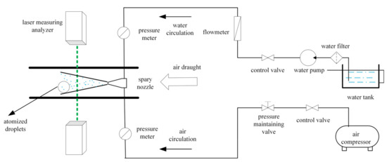 As shown in Figure 2, the experimental setup of the test rig contains injection system, water circulation, air circulation and the visual wind tunnel control system. The injection system includes air-blast spray nozzle, pressure meter and flexible tube. Compressed air and deionized water are transported into the spray nozzle through flexible tubes. The main devices in the water circulation include water tank and filter, water pump, control valve, flowmeter and flexible tubes. Deionized water is selected as the working fluid. The air circulation contains air compressor, control valve, pressure maintaining valve, pressure meter and flexible tubes.
