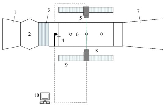 The visual wind tunnel test rig shown in Figure 3 includes a draught fan, thermostat heater, visualization segment and diffusion segment. The air velocity variation in the wind tunnel is realized through altering the frequency of the draught fan. The thermostat heater can produce hot air in the temperature from 20 °C to 90 °C. The rectangle visual test rig is made of transparent acrylic material with the length of 1.6 m and the cross-section area of 0.3 × 0.2 m2 in the convenience of observation. The air-blast spray nozzle is installed in the core of the cross-section at the beginning of the visual segment. Along with the horizontal line of the spray nozzle, observation holes are prepared at different length away from the nozzle for the convenience of laser measuring.