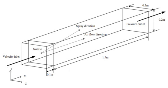 According to the typical treatment process shown in Figure 1 and the schematic diagram in Figure 3, the visual wind tunnel test rig will be selected as the physical model. Deionized water selected as the working fluid is atomized into droplet using compressed air from the air blast spray nozzle and ejected into the wind tunnel. The physical model is established based on the visual segment of the wind tunnel. A three-dimensional physical model is built at the length of 1.5 m, cross-section of 0.3 × 0.2 m2 due to three-dimensional transport direction of the droplet, as shown in Figure 4. The spray nozzle is installed in the central position of the cross-section in wind tunnel 0.1 m away from the entrance. The spray nozzle is set up as diameters of 1 mm inside and 3 mm outside, spraying water and compressed air, respectively.