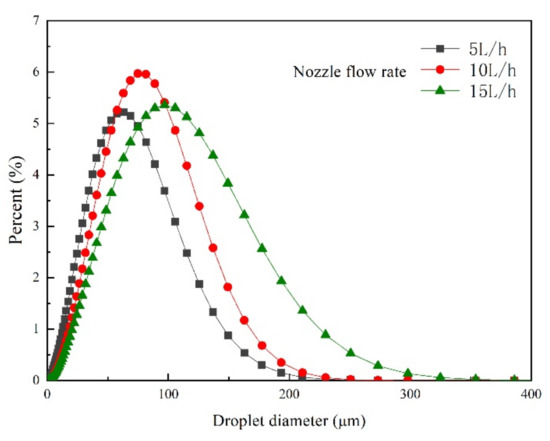 The droplet evaporation performance under different spray nozzle flow rate conditions with the air temperature of 70 °C, air velocity of 2 m/s, compressed air pressure of 0.1 MPa is demonstrated in this section. Figure 7 is the droplet SMD at different flow duct distances from the spray nozzle and Figure 8 is the SMD distribution located at 0.5 m from the nozzle.