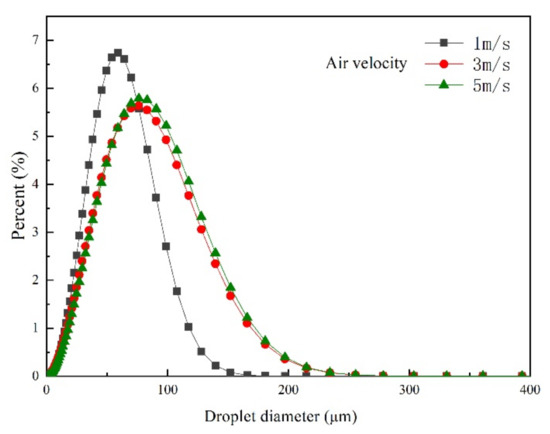 The air velocity has a contradictory impact on the heat exchange process and the droplet evaporation performance. On the one hand, a higher air velocity reinforces the relative motion between the atomized droplets and the surrounding air, therefore higher convection heat transfer rate is achieved along with the better evaporation performance. On the other hand, due to the fact that the droplet residence time plays a key role in the evaporation process, relatively high air velocity in the flow duct may result in a situation where droplets with small diameter and inertia are entrained towards the exit without further evaporation [27,42]. The total quantity of heat exchanged between atomized droplet and flow duct air is weakened, thus deteriorating the evaporation performance. Figure 11 shows that at the same test point along the spray direction, the air velocity influences the SMD on a negative way, indicating that the residence time reduction effect upon atomized droplet is stronger than the convection heat transfer enhancement. The SMD variation trends under three air velocity conditions are the same and similar to the details shows in Section 4.1.1. From Figure 11 and Figure 12, one can notice that the variation of air velocity in the flow duct does not have a significant impact on the droplet diameter and distribution, therefore in the application of FGD wastewater evaporation process a rather low flue gas velocity is recommended for the complete evaporation of droplets.