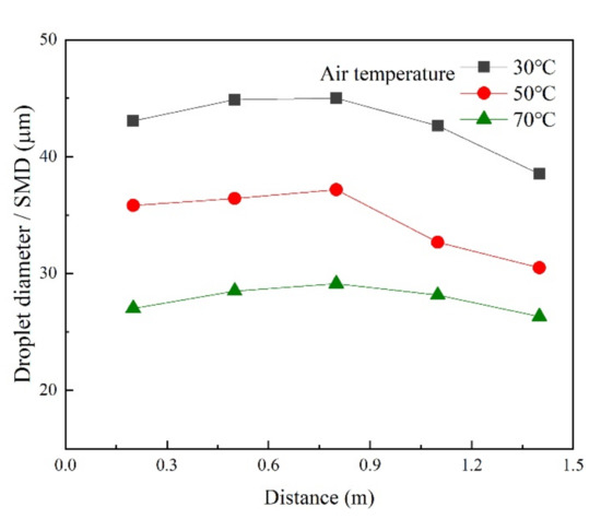 It is evident from Figure 9 that the SMD of droplets in the central segment of the flow duct undergoes an approximate 25% decline when the air temperature is increased from 30 ℃ to 50 ℃ and 70 ℃. When the atomized droplets are sprayed into the unsaturated air flow, heat and mass transfer happen instantaneously due to the temperature difference between the gas-vapor layer of droplets and the surrounding air. The temperature difference between air flow and the droplet surfaces increases when the flow duct air is heated, consequently the average kinetic energy difference between droplet and the surrounding air increases [27,40]. The gas-liquid two-phase flow then undergoes a severe interaction and exchanges heat due to the droplet collisions. The heat and mass transfer between atomized droplets and the surrounding air is strengthened on account of the increment in air temperature, contributing to better evaporation performance of the droplets and a declination in SMD.
