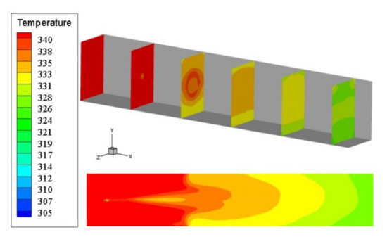Figure 17 is the air temperature nephogram of the wind tunnel under the numerical simulation condition of 5 L/h spray nozzle flow rate, 2 m/s air velocity and 0.1 MPa compressed air pressure. The liquid flow in the spray nozzle is shattered into small diameter droplets by compressed air and ejected conically from the nozzle. At a distance of near 0.2 m away from the nozzle, the droplet aggregation is obvious and only the surrounding air undergoes a temperature decrement. When the atomized droplets continue to move in the flow duct to 0.5 m away from the nozzle, the diffusion of droplets is spread to the flow field and the air temperature experiences a dramatic decline due to the convective heat transfer. As the spray atomization process goes on, the atomized droplets present an arch shape due to the fact that the droplets with spray direction around the nozzle axis have larger velocity than the others. The air temperature in the flow field continues to decrease as the droplet being ejected and absorbing heat for evaporation, resulting the average temperature of approximate 61 °C at the distance of 0.8 m away from the nozzle, 57 °C at the distance of 1.1 m away from the nozzle and 54 ℃ at the distance of 1.4 m away from the nozzle.