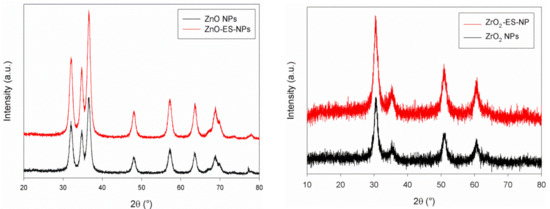 X-ray powder diffraction (XRPD) patterns of nanoparticles (NPs) and 3-glycidoxypropyltrimethoxysilane (GPTMS)-capped NPs: ZnO and ZnO-ES (left); ZrO2 and ZrO2-ES (right).