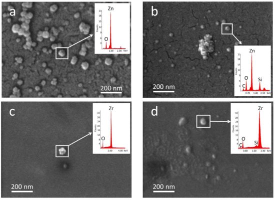 Scanning electron microscopy (SEM) micrographs of investigated NPs and GPTMS-capped NPs: (a) ZnO; (b) ZnO-ES; (c) ZrO2; (d) ZrO2-ES. Corresponding EDS spectra are in the insets; Au peaks (2.1–2.2 KeV) in the spectra are due to gold sputtering of the samples.