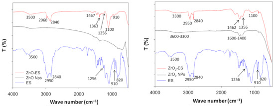 XRPD measurements also provided information about the size of both plain and functionalized NPs. According to the Scherrer equation, the size of ZnO particles ranges between 63 and 71 nm, while the size of ZnO-ES NPs is in the 26–56 nm range. Size values calculated for ZrO2 NPs are in the 51–93 nm range, and they drop down to 43–60 nm after silane grafting (Zr + ES). According to the XRPD data, the sizes of plain NPs are larger than the functionalized NPs both for ZnO and Zr2O. This behaviour may be ascribed to the prevention of agglomerations due to the surface functionalization of NPs.