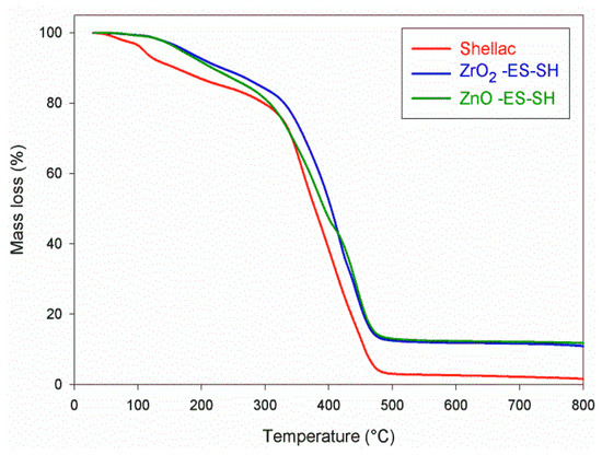 Thermogravimetric analysis profiles of plain shellac (SH) and of the nanocomposites ZnO-ES-SH and ZrO2-ES-SH.