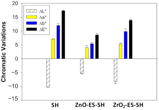 Chromatic variations experienced by wood specimens coated with SH, Zn-ES-SH, and ZrO2-ES-SH after ultraviolet (UV) irradiation (500 h).