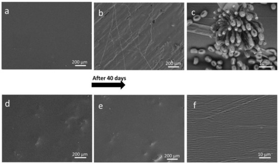 SEM micrographs taken on the surface of SH and ZnO-ES-SH specimens before and after 40 days are reported in Figure 7. At the end of the test, mold colonies are diffusely present on the surface of plain shellac (Figure 7b,c), while the surface of wood specimens treated with ZnO-ES-SH has the same appearance as before treatment (Figure 7d,e) and no structure ascribable to mold can be observed even at high magnification (Figure 7f).