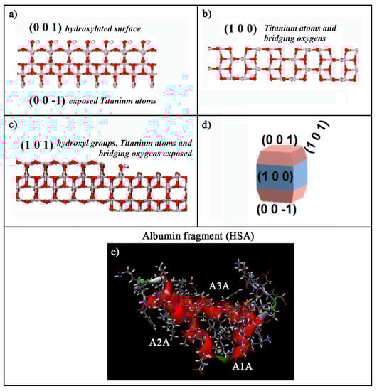 The four different crystallographic TiO2 anatase faces studied in this work are reported in Figure 1 panels (a–c), together with a model of a nanosized crystal (panel d). The (0 0 1) TiO2 anatase surface exposes hydroxyl groups, the (0 0 −1) TiO2 facet exposes titanium atoms, the (1 0 0) TiO2 surface exposes both titanium atoms and bridging oxygen atoms; the (1 0 1) TiO2 anatase face exposes hydroxyl groups, titanium atoms and bridging oxygen atoms. The albumin fragment studied in previous work [65] at physiological pH is reported in panel (e). This fragment is composed by three α-helices A1A, A2A, A3A connected as in the chemical structure reported in PDB [74]. At first, in Section 3.1, this HSA fragment will interact separately with the individual four crystallographic surfaces reported in panels (a–c) mentioned above. In the second step, in Section 3.2, the protein fragment adsorption will be considered on a model 3D nanocrystal of anatase exposing the three (0 0 1), (0 0 −1) and (1 0 0) faces, as previously studied about competitive adsorption of small quinoline molecules important for a photocatalytic activity [68,69].
