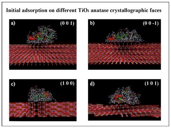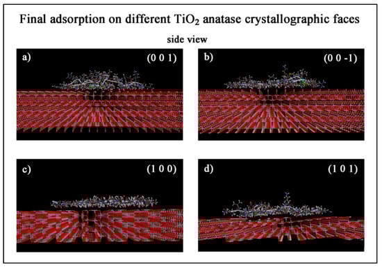 The initial most stable optimized geometries after molecular mechanics (MM) calculation for the four TiO2 anatase crystallographic surfaces considered, the (0 0 1), (0 0 −1), (1 0 0), (1 0 1) facets in panels (a–d), respectively, are reported. In particular, in panel (c), the initial optimized geometry is the same geometry as reported in previous work [67], shown here for comparison. For the color code, see Figure 1.